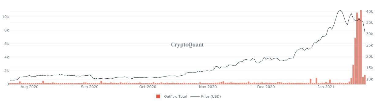 Major spikes in volume at Coinbase Pro had accompanied price volatility in recent weeks. Previously, it was chasing up the price of BTC. This time, selling pressure was observed as a dip in the so-called “Coinbase Premium” happened. The “Coinbase Premium” measures the price difference between the BTC/USD pair at the professional trading arm against other exchanges. The premium in price suddenly became negative during the selloff, suggesting that whales on Coinbase were leading the selloff.
