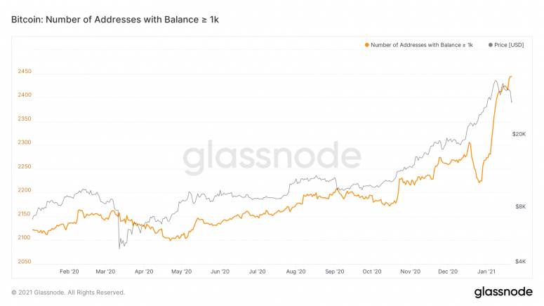 Not only Grayscale and MicroStrategy bought BTC on the dip, but many other large whales also added to their stable, as the number of addresses with more than 1,000 BTC continued to climb during the BTC selloff.