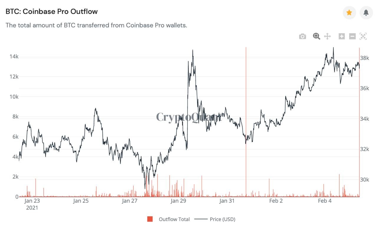 Coinbase Pro BTC outflows hit two ATHs within the space of one week, with a total of 30,000 BTC withdrawn from the exchange, suggesting a long-term holder whale has been accumulating BTC and taking it off the exchange. According to industry chatter, the 30,000 BTC was acquired for Tesla.